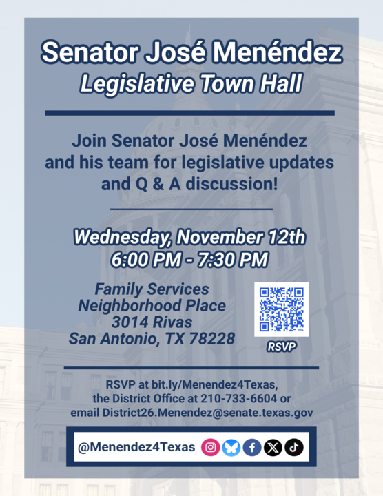 Senator Jose Menendez would like to invite you to his Legislative Town Hall taking place November 12th at the Family Service Neighborhood Place. He will be providing legislative updates that took place during the 89th Legislative Session and the two special sessions. There will be a time for Questions and Answers. Please share the flyer with neighbors, friends and family.